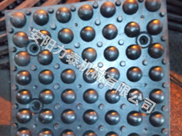 造球盤底襯安裝鑄石材料后,短期內會在球盤底面形成一層底料,可以加速成球過程,但是在使用一段時間后,由于底料在生球不斷滾動的作用下將變得越來越緊密,底料的溫度不斷升高,疏松的物料很容易粘附在其表面,使底料加厚,隨著底料的逐漸加厚,造球盤的負荷增加,同時由于鑄石板的自身比重較大,兩種負荷加在一起給球盤的傳動部位造成很大阻力,致使傳動部位的軸承、齒輪極易損環,電耗增加,給生產和維修帶來很大麻煩,加大了維修工人的勞動強度,提高了維修費用,降低了生產效率。 根據我公司與燒結球團行業的一些相關技術人員和專家的多方面交流以及我們多年來在制作球盤內襯方面的一些經驗總結,在球盤底部采用表面帶有圓柱體的高耐磨造球盤襯板。