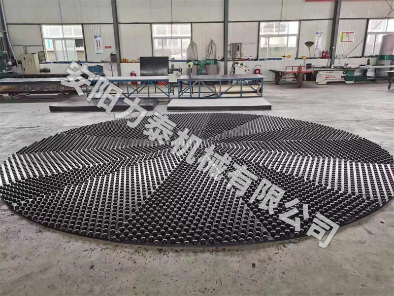 造球盤底襯安裝鑄石材料后,短期內會在球盤底面形成一層底料,可以加速成球過程,但是在使用一段時間后,由于底料在生球不斷滾動的作用下將變得越來越緊密,底料的溫度不斷升高,疏松的物料很容易粘附在其表面,使底料加厚,隨著底料的逐漸加厚,造球盤的負荷增加,同時由于鑄石板的自身比重較大,兩種負荷加在一起給球盤的傳動部位造成很大阻力,致使傳動部位的軸承、齒輪極易損環,電耗增加,給生產和維修帶來很大麻煩,加大了維修工人的勞動強度,提高了維修費用,降低了生產效率。 根據我公司與燒結球團行業的一些相關技術人員和專家的多方面交流以及我們多年來在制作球盤內襯方面的一些經驗總結,在球盤底部采用表面帶有圓柱體的高耐磨造球盤襯板。